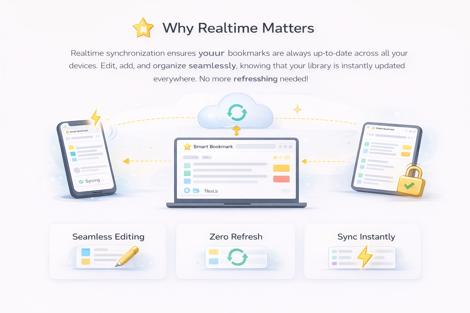 In Smart Bookmark, realtime synchronization ensures that bookmarks remain consistent across multiple tabs, browser windows, and devices. Users can open the application anywhere and trust that what they see reflects the true current state of their data.
